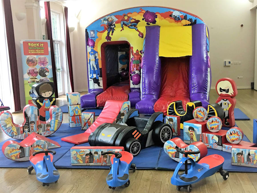 Super Hero Deluxe Soft Play and Bounce n Slide inflatable for hire Essex
