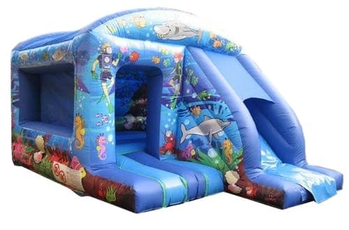 This Under the Sea themed bouncy castle with slide attached is a popular activity unit for childrens birthday parties. Children of all ages love to bounce and slide on this bouncy castle which has a cover to protect from the rain or sun.