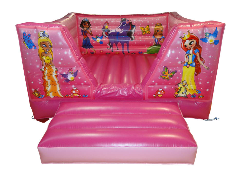 Little girls love our PRINCESS Pony themed Bouncy Castle. Featuring beautiful princesses and their trusted pony ready to welcome little guests to bounce on this lovely pink bouncy castle. This PRINCESS Pony themed bouncy castle is available as part of our Low Height Bouncy Castle hire range. It is also part of our interchangeable Velcro Range and comes with a choice of different colour base units to choose from at time of booking subject to availability, and available as part of our Discounted Indoor Package with other matching inflatables in the Princess Pony range, including Princes Turret Bouncy Castle and Princess Bounce n Slide Measurements: 12.8 x 15.7 x 6.6ft (WxLxH) Area required: 16 x 23 x 7ft (WxLxH) This bouncy castle is a great addition to our PRINCESS Range and available to hire as part of our discounted Indoor PACKAGES range. This inflatable is open topped and does not have a rain/sun cover.