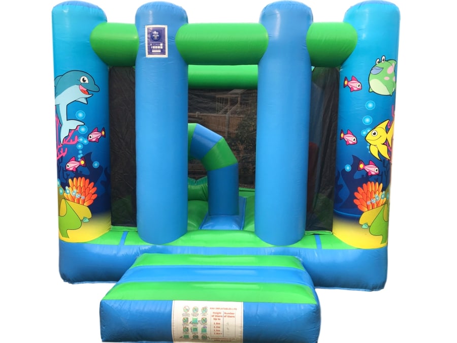 This Under Sea Activity Bouncer is a great alternatively to just a bouncy castle. With it's bright colours and vibrant Under Sea themed artwork this activity inflatable has 2 biff bash, a hoop and climb through arch on the bed to amuse the children while playing on the bouncy castle. With fully netted sides, parents can watch their children playing safely in this enclosed inflatable.
