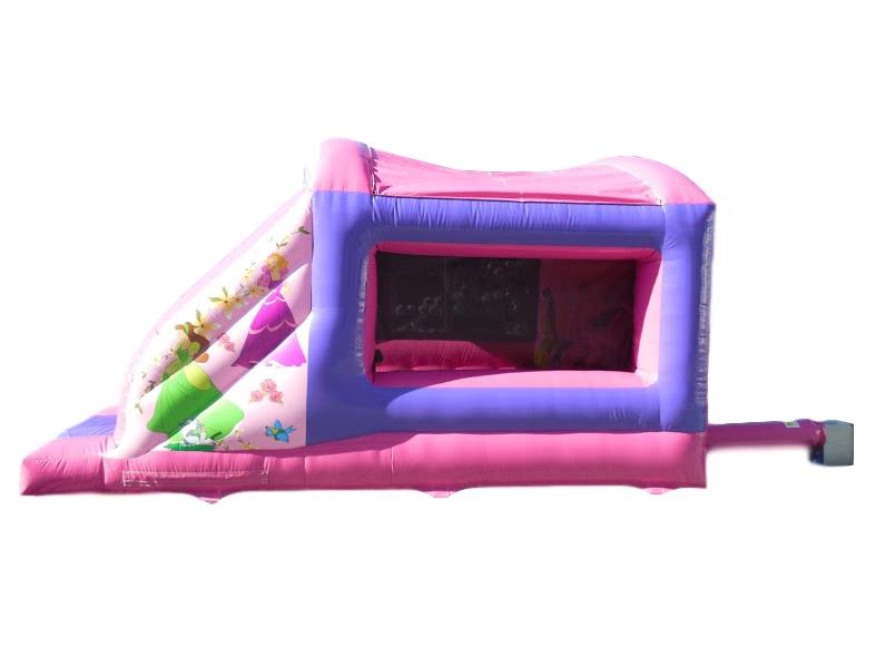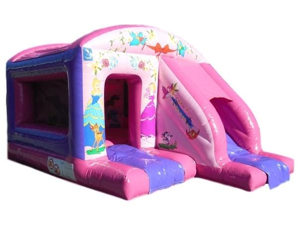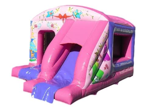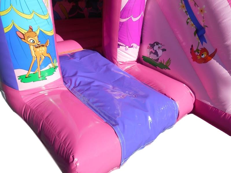 This pink Princess bouncy castle with slide attached is a popular choice for any little girls birthday party. Your daughter and her friends will love to bounce and slide on this princess themed inflatable that will provide hours of fun. The pretty Princess artwork is sure to impress.