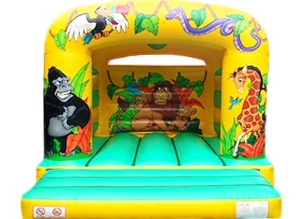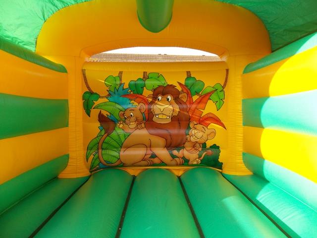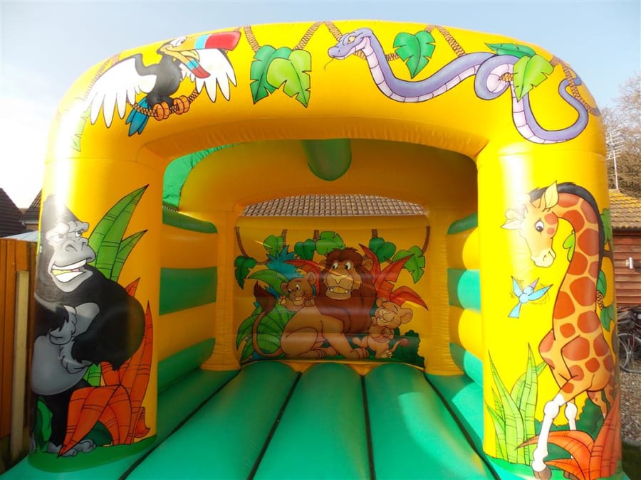 This jungle themed bouncy castle has a built in cover to protect against showers or to provide shade on the bed on a sunny day.