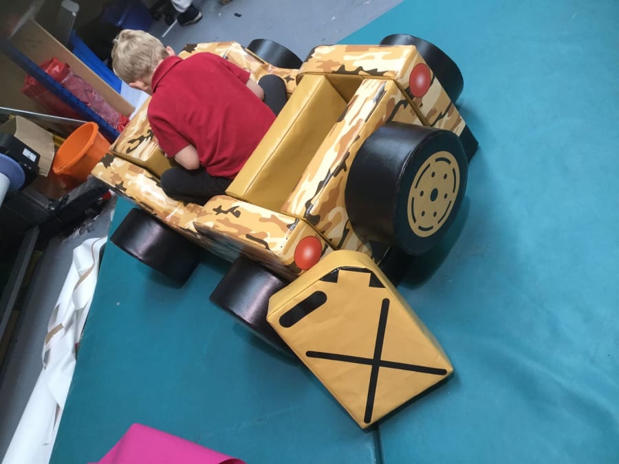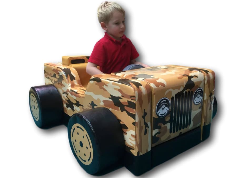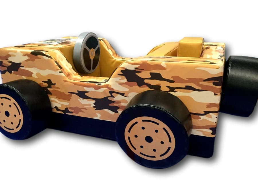 This soft play Safari Jeep is a great add on item to our Soft Play packages. The Jeep is printed in camouflager design and comes with a pretend oil can for role play.. This is a Build n Play model so the children can pull it apart and rebuild, all the wheels come off as well as the spare wheel at the back.