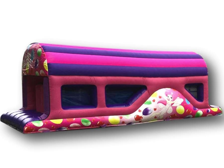 NEW for 2017 is this fab Fairy themed Fun Run which we have commissioned in pink and purple to match our popular Princess Fairy Bouncy Castle. At only 25ft long this can fit in most peoples gardens and because of it's low height will also fit comfortably in most halls where it can get packaged with other items in our Princess Range
