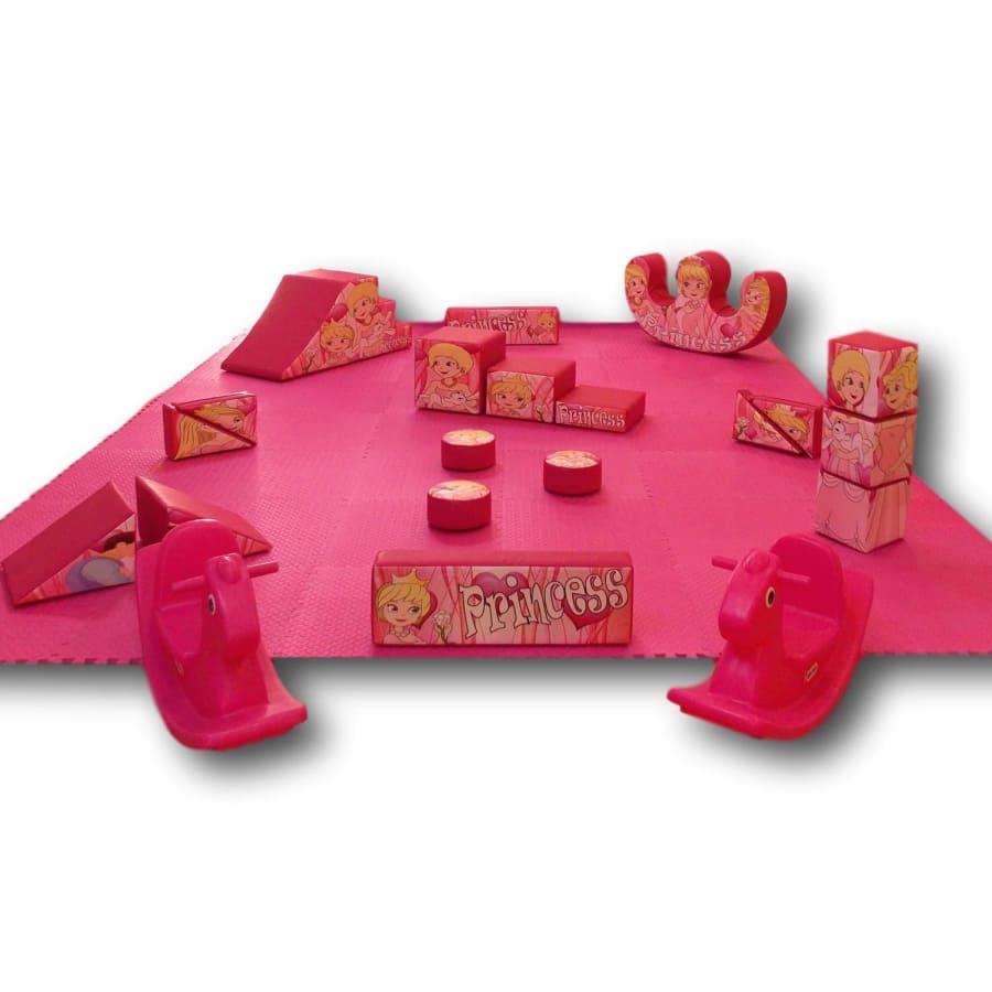This is our Princess Trio Soft Play. This pretty pink princess soft play is beautifully printed with 3 princess characters and available to hire with additional matching items.
