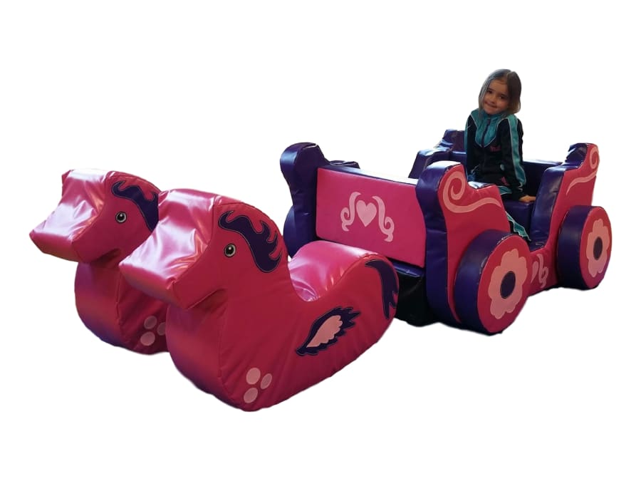 Our latest addition to our Princess Deluxe Soft Play range it this fabulous sit in carriage pulled by magical winged horses together with lots of soft play shapes, a Little Tikes Pink Climb n Slide and 2 pink Rockers for your little Princess and her friends to enjoy.