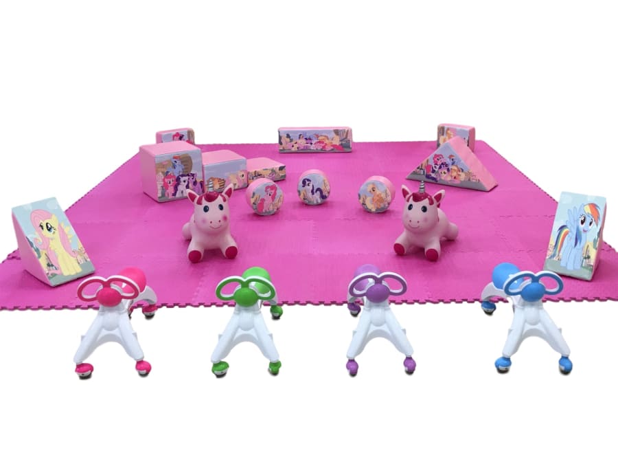 The Unicorn Pony Soft Play set and Bouncy Castle themed package consists of 12 soft play shapes, 2 Unicorn Hoppers, and a set of 4 Didi Walk n Rides, all nicely presented on a matted area. During the booking process you get a choice from 2 Unicorn themed bouncy castles.